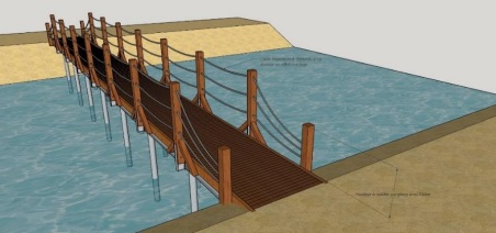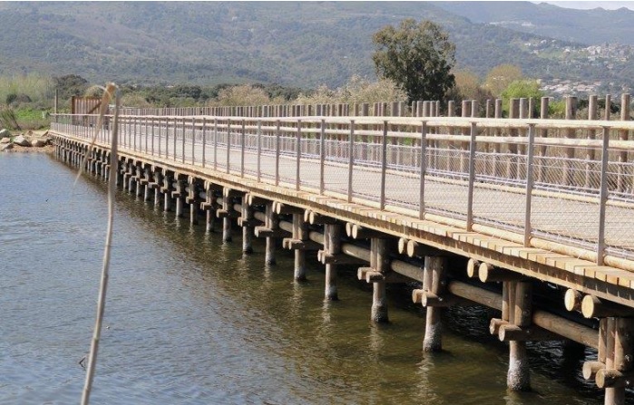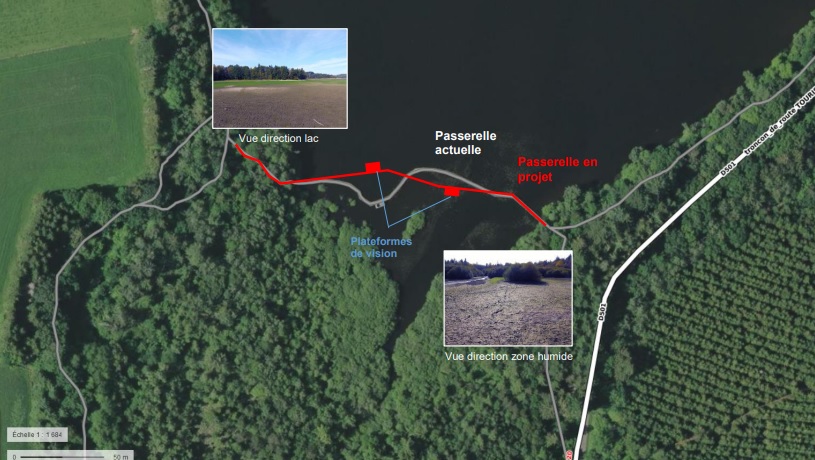 - La largeur de passage sur la passerelle passe de 1.5 m pour l’ancienne passerelle à 2 m de large sur la nouvelle passerelle. - Le cheminement, en lignes dites brisées, doit être constitué de 4 sections droites avec 3 angles doux pour changement de direction, et le platelage doit dessiner une forme harmonieuse à ces angles. - Deux plateformes de vision seront également réalisées sur ce cheminement. - Elles auront une
