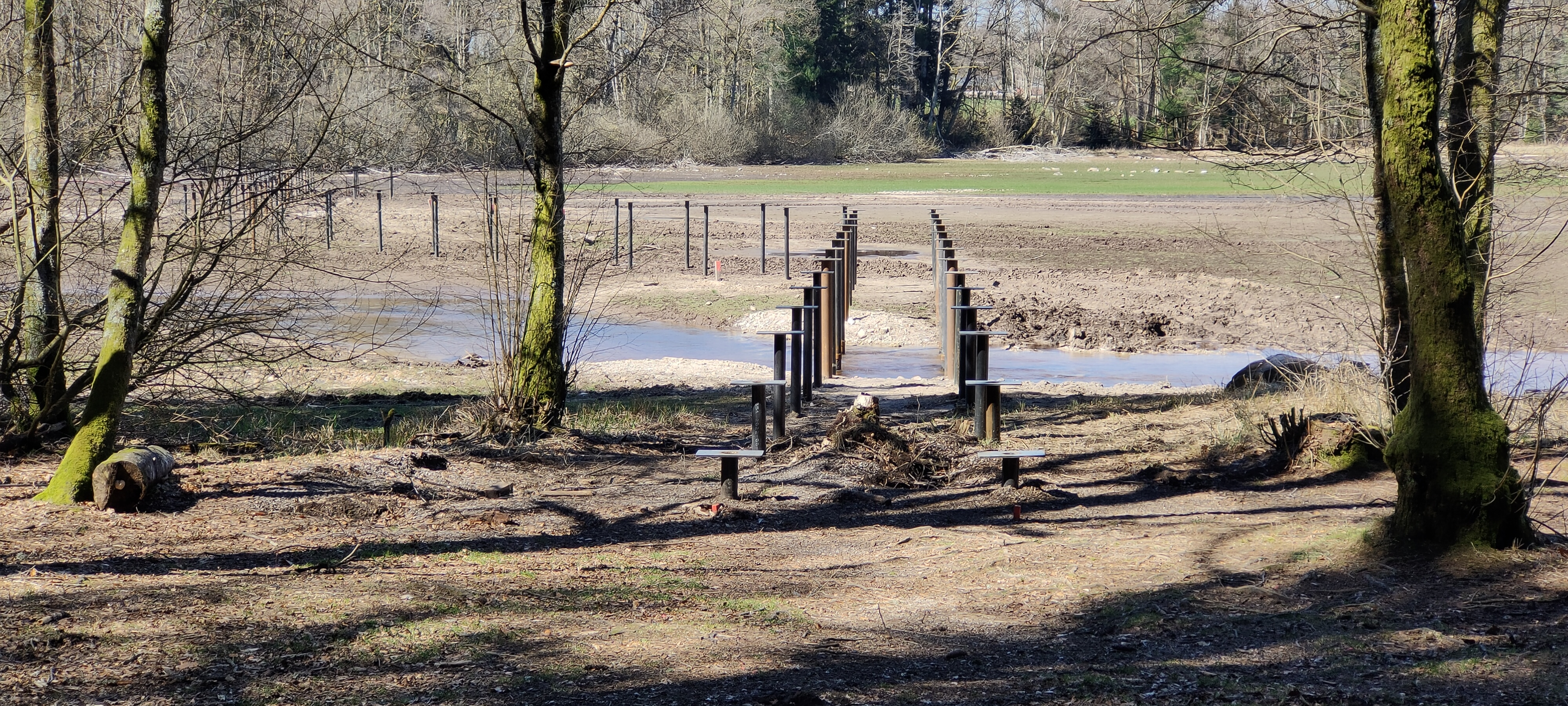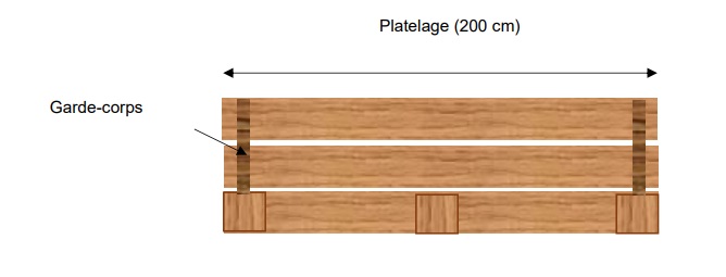 dimension de 5 m x 4 m, soit 20 m2, et elles seront adjacentes au ponton. Toutefois : Elles devront être capables de supporter une charge égale à 500 kg/m2 Une des deux plateformes sera tournée côté rive/zone marécageuse, l’autre côté lac. - La fourniture et la mise en place de bancs en douglas sans dossier sont prévues et à installer sur les plateformes de vision ; les dimensions sont 2,40 m (longueur), 0,30 m (largeur) et 0,50 m (hauteur hors-sol). - L’emplacement précis sera désigné par le maitre d’œuvre. - L’épaisseur du banc sera semblable à celle des platelages, et les pieds en douglas seront fixés sur le platelage à l’aide de platines en acier galvanisé. - Démontage, évacuation et remplacement des chicanes et panneaux aux deux entrées de la passerelle - Fourniture de mobilier réduisant l’accès à la passerelle. (Tous les mobiliers doivent être réalisés avec les mêmes matériaux – douglas - et dans la même esthétique que la passerelle. - A l’entrée Est de la passerelle (route touristique), il sera demandé de mettre en place une barrière (douglas) de 3 mètres, constitué de deux éléments d’1m50 identiques aux garde-corps de la passerelle (voir croquis ci-dessous).