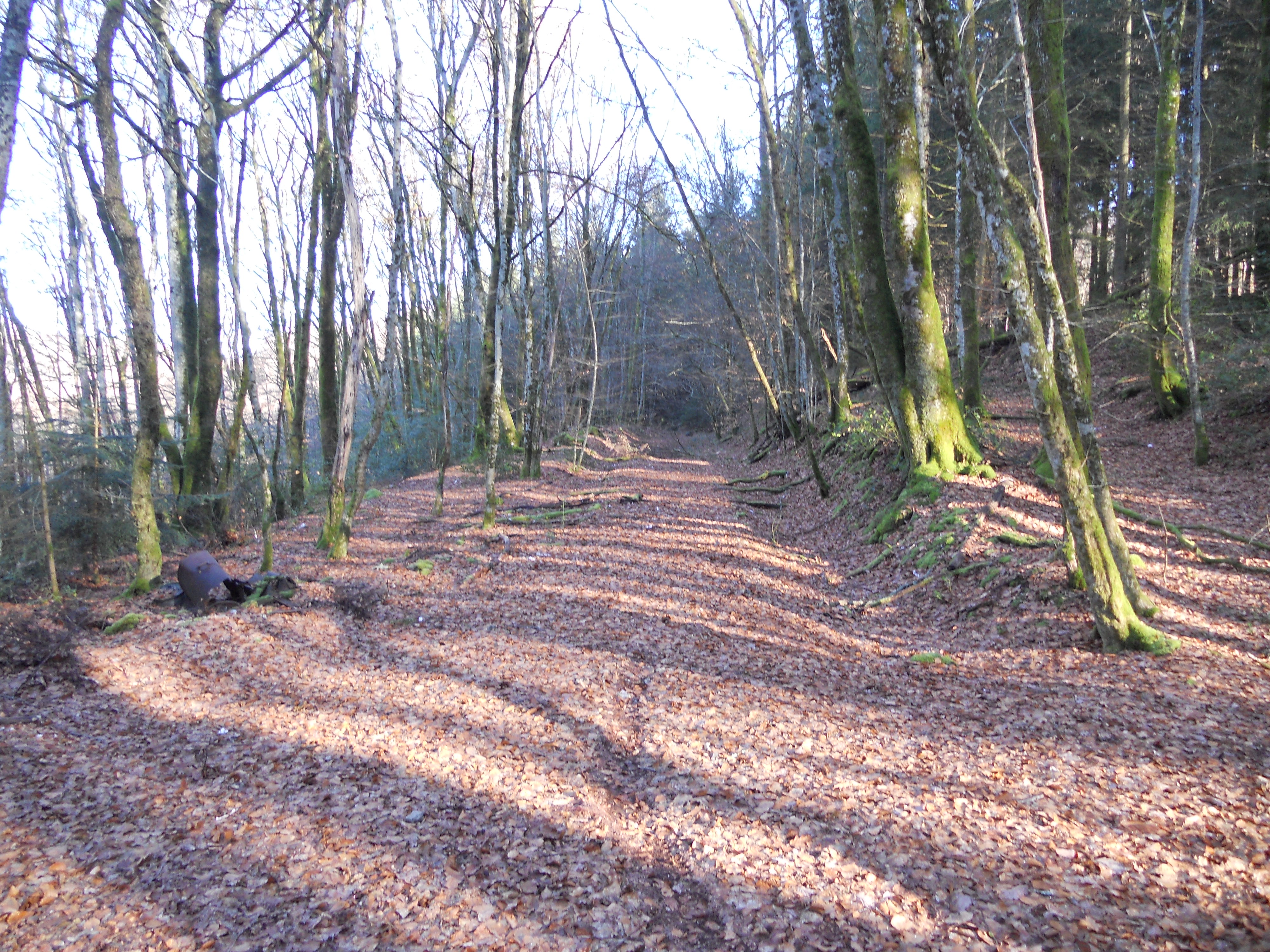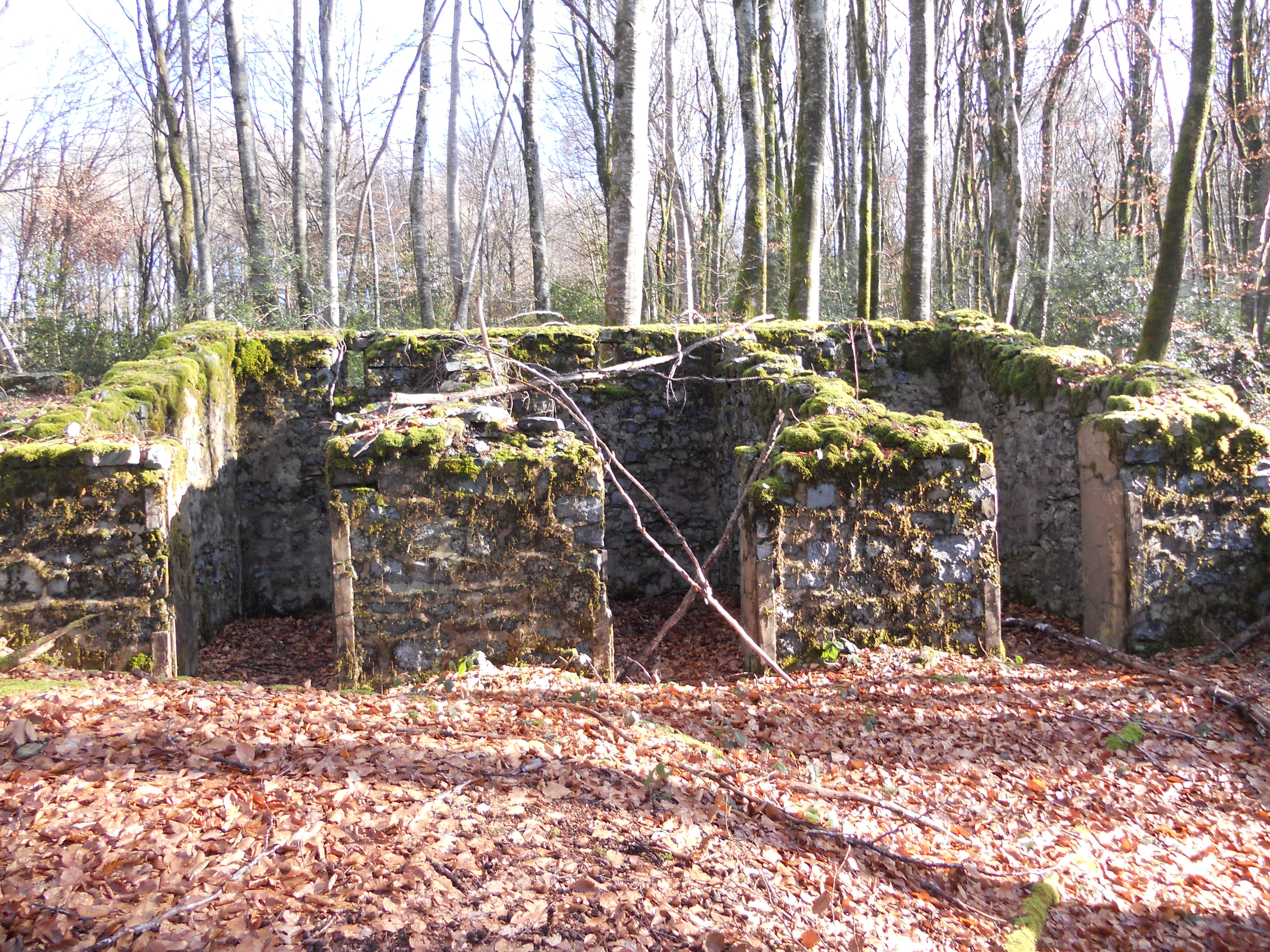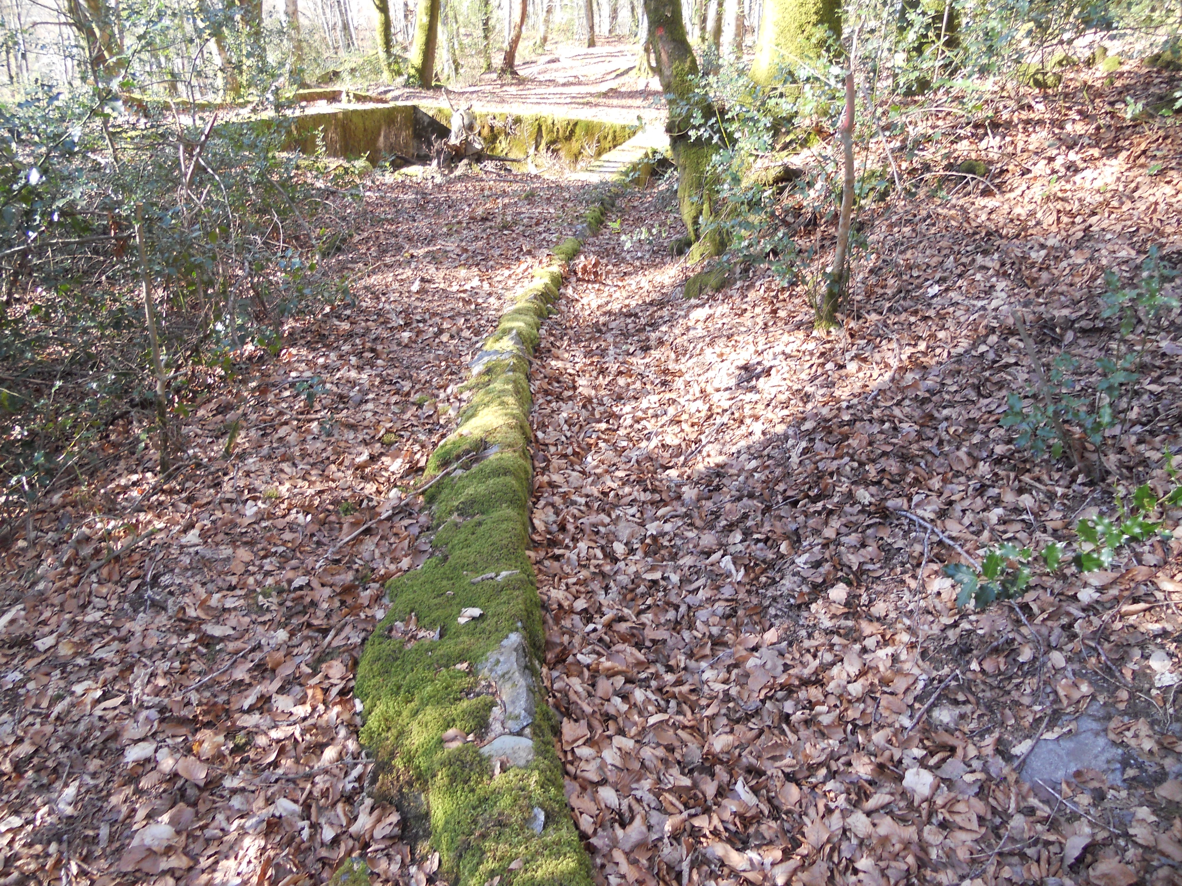 Le camp était contenu dans la partie Est de la route. D'après les vestiges, il aurait été composé de : - 2 postes de garde (haut et bas) Dans son article publié dans VDM (n°514), Christian Bouchoux avait attribué à Michel Beaussier la (re)découverte de la prise d'eau de la rigole alimentant le camp. Exact ! Après 2 tentatives infructueuses, j'ai eu la chance de trouver le bon guide qui m'y a conduit directement. La prise d'eau est bien identifiée, située près de la cascade, sur la rive droite du ruisseau de la Proie, proche du hameau des Joies, soit à environ 1,5 km du camp. Il faut néanmoins préciser que 2 autres rigoles, partant sensiblement du même endroit, avaient un peu semé la confusion dans les recherches. La première, située sur la rive gauche (et donc ne pouvant pas conduire au camp) et la seconde sur la rive droite prenant origine entre le ruisseau de la Proie et la rigole d'alimentation du camp. Ces deux rigoles étaient destinées à l'irrigation de quelques terrains voisins. La rigole du camp est elle reconnaissable au muret maçonné qui la soutient, environ 200 mètres après son origine (et qui a miraculeusement échappé à la chute d'un arbre...). C'est aussi celle qui suit au plus près (quoi que...) l'actuel chemin.