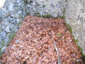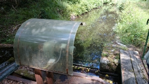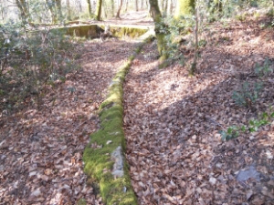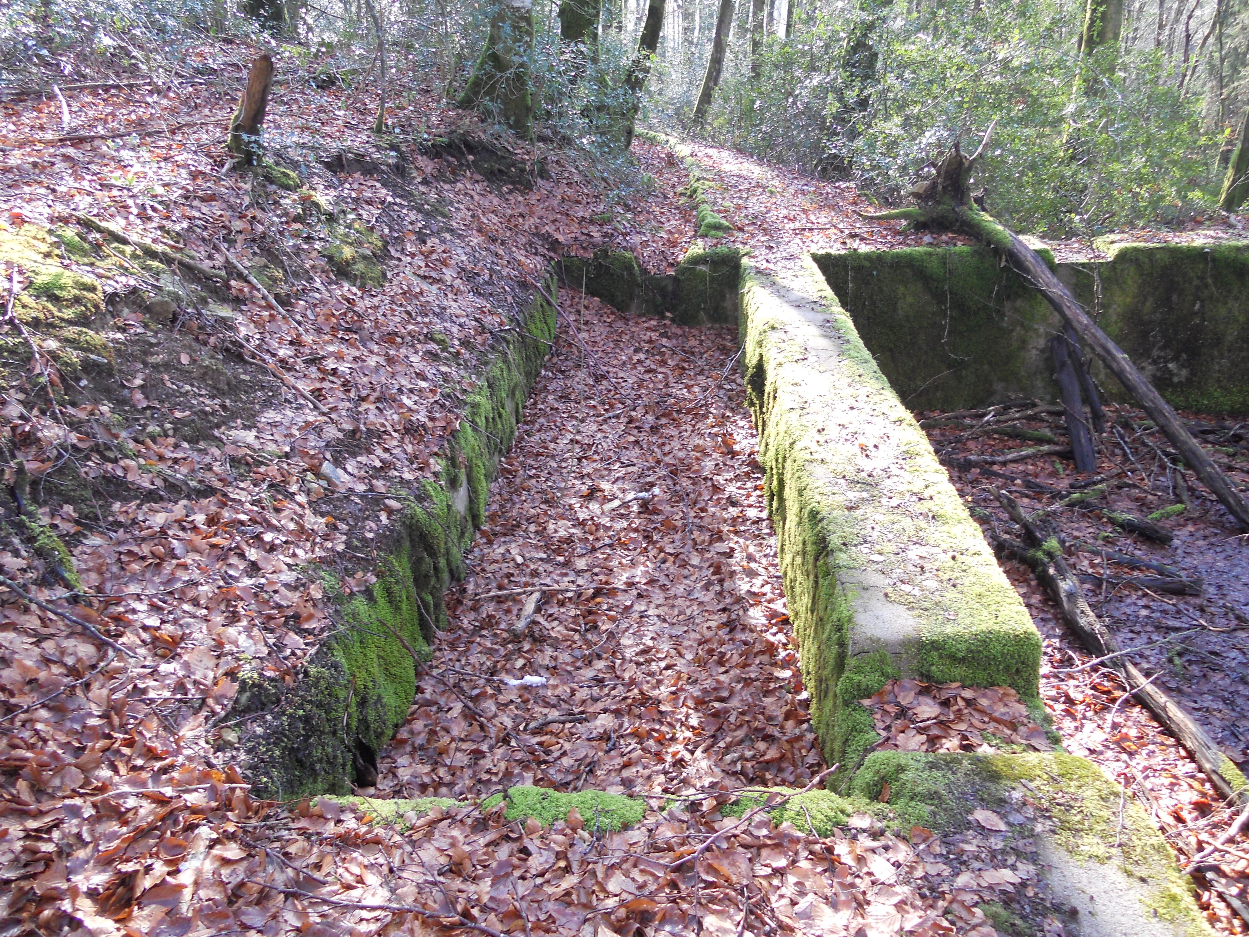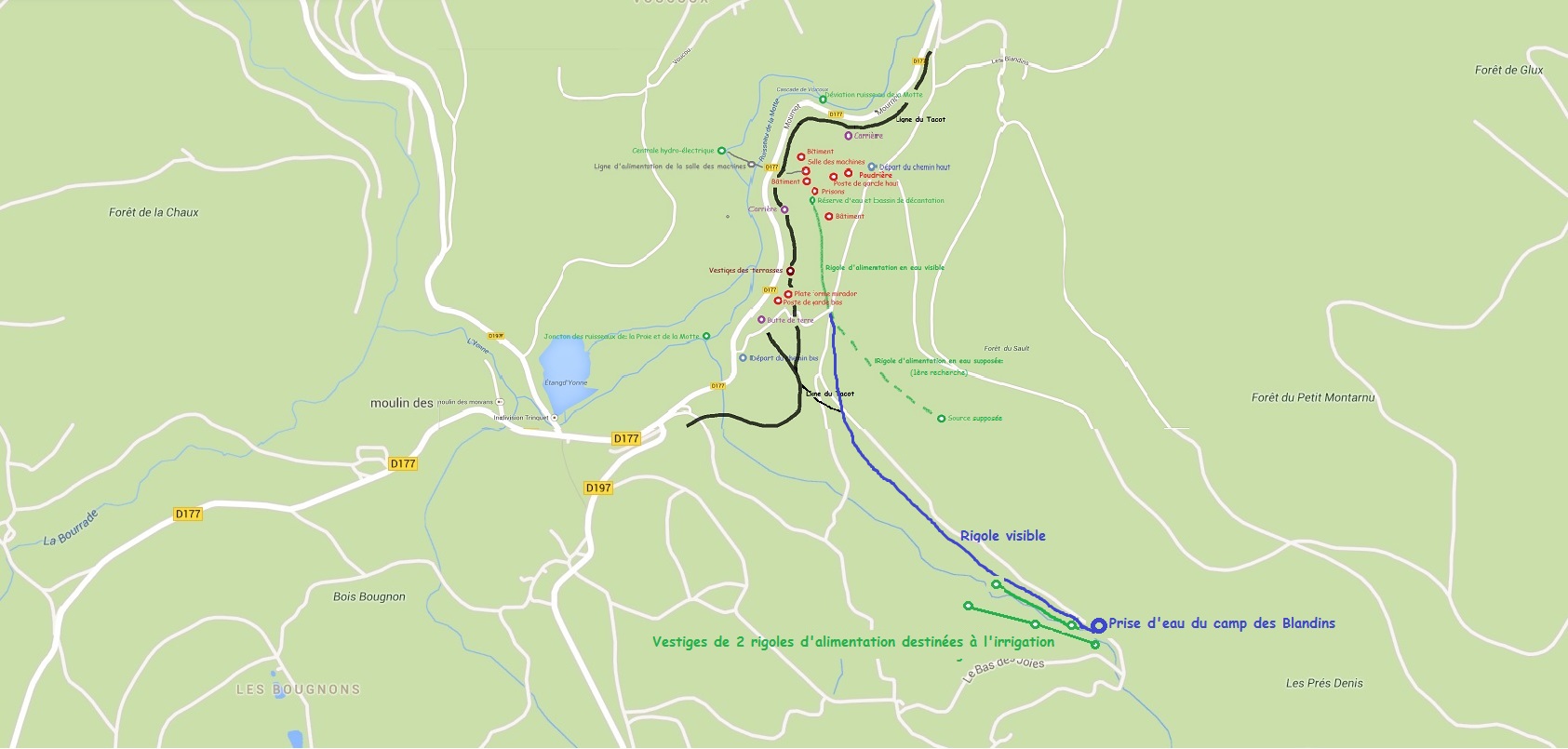 La ligne du Tacot ayant une prise d'eau aux Blandins pour la locomotive, nous pouvons supposer que cette rigole a été entretenue au maximum jusqu'aux années 1938/1939, date du démontage de l'ensemble des rails de la ligne. 75 années d'abandon (et de débardages...) ont quelque peu faussées le paysage mais les traces restent encore visibles.