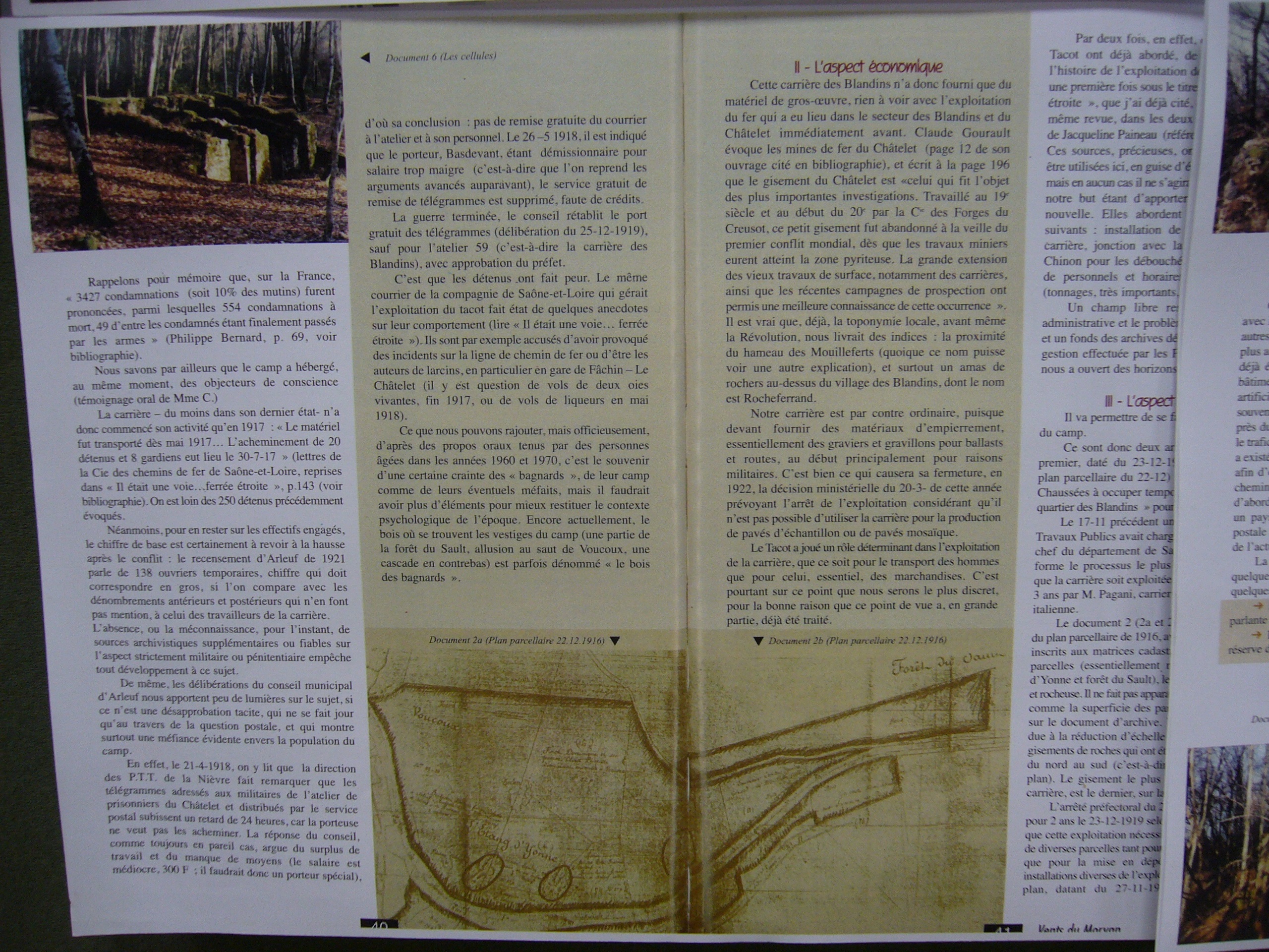 Pour y remédier, l’administration de la justice militaire multiplia sur le territoire métropolitain ce qui existait déjà en nombre dans les colonies : les « Ateliers de travaux publics ». C’est bien de cela dont il était question aux Blandins. Un document du Service Historique de la Défense (armée de terre - 13 J 1491 - Prisons militaires) cite de nombreux établissements et parle de 38 ateliers existant encore sur le territoire métropolitain en 1919. Ce "Répertoire numérique détaillé" est le fruit d'un énorme travail réalisé par la section des archives de la justice militaire du SHD, la synthèse de tous les documents retrouvés ayant trait aux Ateliers de travaux publics, ce qui représentait quelques 600 cartons qu'il a fallu lire, trier et ordonner, et l'atelier 59 n'y figure pas... Ce document (150 pages) est disponible sur le site du SHD ou sur ce site d’Eulglod à l’adresse : https://www.eulglod.fr/morvan/Le Haut Folin/Le camp des Blandins/SHDGR_INV_13J1491.pdf Que les archives de Divisions largement malmenées et bombardées sur les lignes de front aient pu disparaitre, soit ! Mais s'agissant de ce camp, à Arleuf ????? Où se trouve ce camp ?On le dit souvent situé