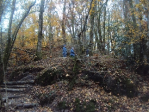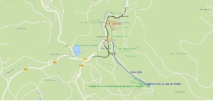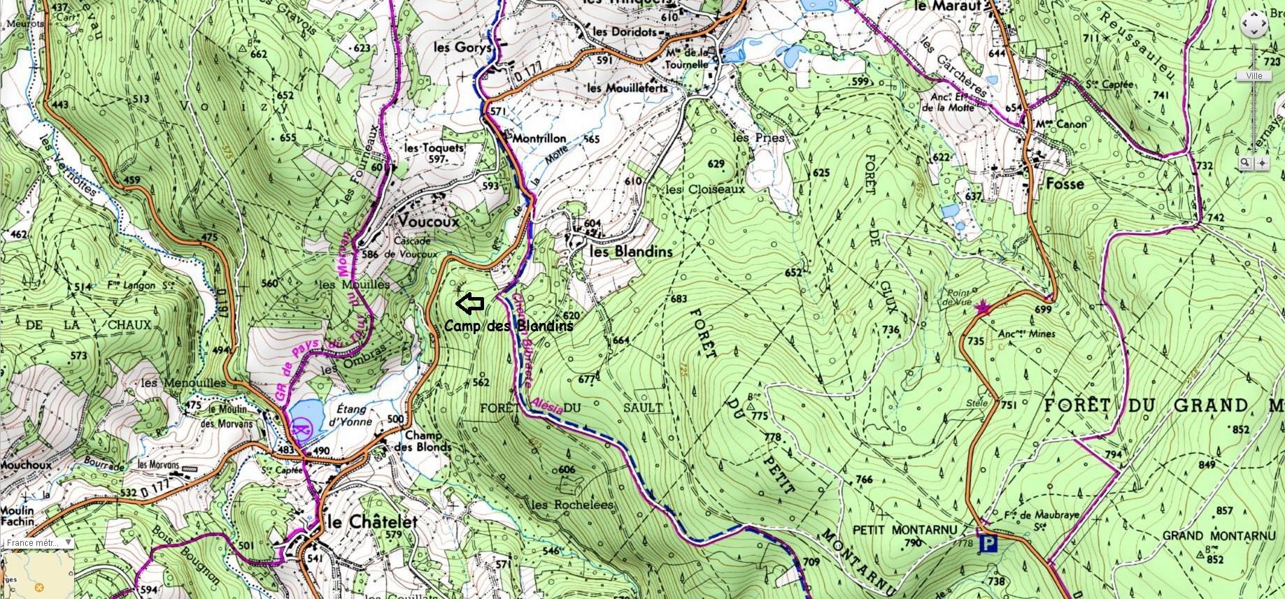 A la sortie d’Arleuf, entre Autun et Château-Chinon et dans cette direction, se trouve un remarquable point de repère : « Le Cornemuse », célèbre auberge reconnaissable à sa façade aux couleurs vives et aux multiples décorations. Une centaine de mètres plus loin sur la gauche, une route descend vers « Le Châtelet ». Quelques centaines de mètres avant le hameau du Châtelet, et cinquante mètres avant un petit pont qui enjambe le ruisseau de la Proie, vous devriez entrevoir un chemin sur votre gauche. Après 5mn de marche facile, vous serez face à une butte de terre d’environ 3m de hauteur, une ancienne plate-forme du «Tacot ». De là, 2 solutions s’offrent à vous : - Prendre le large chemin à droite pendant 20mn de marche facile jusqu’au niveau 47° 1’ 15.79"N et 3° 59’ 45.50’’ E (voir également « Départ du chemin haut » sur la carte de reconstitution du site dans le paragraphe suivant), puis descendre le chemin sur votre gauche, vous trouverez rapidement la poudrière et le poste de garde haut (là, c’est de la marche « dans les bois ») le reste du camp se situant un peu plus bas sur la gauche. - Prendre le chemin de gauche (de face) et en moins de 5mn vous tomberez sur le poste de garde bas ainsi que sur un escalier. En continuant sur ce chemin vous retrouverez et suivrez le tracé de l’ancienne voie du « Tacot ». Ensuite il faut oublier l’expression « marche facile ». Les tempêtes de 1999 mais aussi celle qui remua la région en juillet 2003 ont quelque peu corsé la difficulté. En effet, de nombreux arbres sont couchés sur le passage et vous devrez suivre « le chemin des sangliers » (dont on aperçoit de nombreuses traces) qui évite ces embûches.