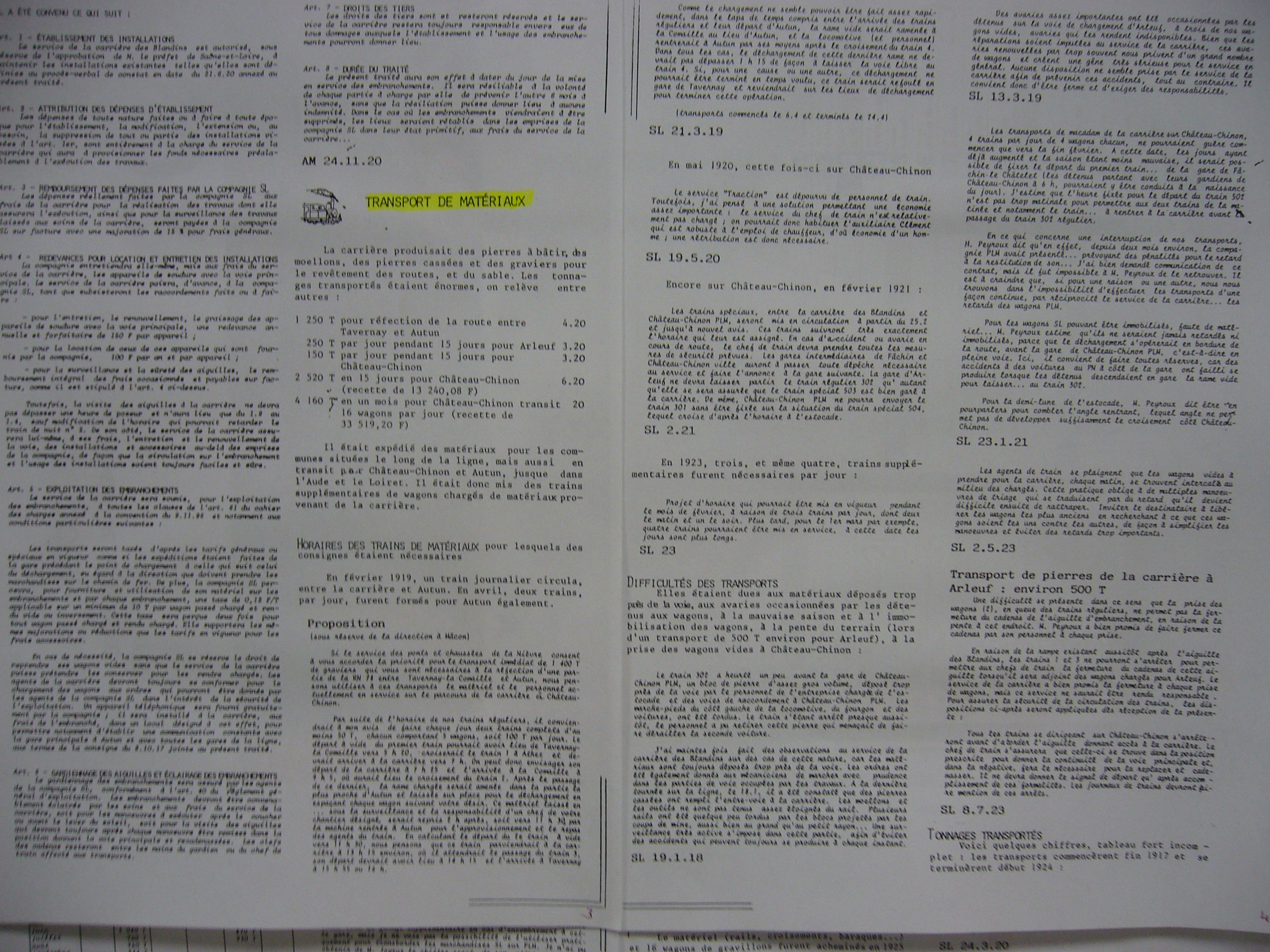 Le 8 juin 1920, une note de la CCFSL précise que M. Pagani fait fabriquer des pavés (à titre d’essai) au rocher « des Corvées » avec installation sans autorisation d’une petite voie « Decauville » en bordure de la voie du Tacot. - Déjà 3 ans d’essais et une voie Decauville ? Le 10 juin 1920, une autre note demande sa mise en demeure de sortir de l’emprise des voies. Le 14 mai 1924, M. Peyroux achète les parcelles contenant le rocher «des Corvées », acte de vente établi devant Maître Duvernoy d’Anost entre : « - M. Simon Ravier, propriétaire, et Mme Anne Ravier, son épouse qu’il autorise, demeurant ensemble aux Pignots, - Mme Jeanne Ravier, propriétaire demeurant aussi aux Pignots, veuve de M. Pierre Billon, lesquels ont, par ces présentes, vendu, sous les garanties solidaires de tout trouble, dette, charge, éviction, surenchère et autre empêchement quelconque, à M. Joseph-Auguste Peyroux, Ingénieur des Travaux Publics, demeurant à Arleuf, ici présent……… ». A noter également le point suivant de l’acte : « La présente vente est, en outre, consentie et acceptée moyennant la somme de 3000 F de prix principal, que l’acquéreur a payé directement, et sans la participation du notaire soussigné, aux vendeurs qui la reconnaissent et en donnent bonne et valable quittance… » Entre 1925 et 1933, la carrière « des Corvées » fabriqua des pavées pour la région mais aussi pour Paris et sa banlieue alors gros consommateurs pour le pavage des rues. Elle aurait, au mieux, employé une quinzaine d’ouvriers (8 heures par jour et 6 jours sur 7). Bien que le patron, M. Peyroux, ait été surnommé « le Commandant de la carrière », il semblerait que les ouvriers (ouvriers et non prisonniers) aient été d’origine italienne et non des prisonniers français comme on pourrait le penser. Le tableau ci-dessous émanant des archives de la CCFSL et repris dans l’ouvrage de Jacqueline Payneau « Il était une voie… ferrée étroite » rapporte quelques volumes. Transports depuis "les Corvées" Le 26 décembre 1933, la carrière « des Corvées » est définitivement fermée et les terrains revendus par les héritiers de M. Peyroux reviennent à leurs précédents propriétaires : « Entre les soussignés : M. Albert Peyroux, entrepreneur demeurant à Montreuillon, agissant tant en son nom personnel qu'au nom et se portant fort pour sa mère, Marie-Eléonore Legrand, veuve de M. Auguste Peyroux, demeurant à la Charité-sur-Loire, d'une part ; M. Lazare Ravier (né du mariage de Simon Ravier avec Anne Ravier), cultivateur demeurant aux Pignots, époux de Mme Jeanne-Marguerite Allyot, d'autre part ; Il a été convenu ce qui suit : M. Albert Peyroux, es-qualités, vend par les présentes, à M. Lazare Ravier qui accepte, deux parcelles de terrain en nature de bois, situées sur la commune d'Anost, lieu-dit "les Corvées" et portées au cadastre de ladite commune sous le n° 165 p, section G. L'une de ces parcelles, d'une contenance de 16 a, est à prendre du côté du bois qui appartient déjà à M. Ravier, et a 70 m de longueur ; l'autre parcelle, d'une contenance de 4,15 a, est à prendre entre la ligne du chemin de fer économique de Saône-et-Loire d'Autun à Château-Chinon et celle de la carrière. Origine de la propriété : Les immeubles ci-dessus désignés appartiennent à M. Albert Peyroux et à Mme Vve Peyroux, comme dépendant de la communauté de biens ayant existé entre M. Joseph-Auguste Peyroux, décédé à Château-Chinon le 26.11.33 et Mme Marie-Eléonore Legrand, sa veuve. M. Peyroux en était propriétaire pour les avoir acquis de M. Simon Ravier et Mme Jeanne Ravier. La présente vente a lieu aux conditions ci-après : l'acquéreur sera propriétaire des immeubles vendus à compter du 1er janvier 1934. Il prendra les biens dans l'état où ils se trouveront sans recours contre les vendeurs. En outre, ladite vente est consentie et acceptée moyennant le prix de 100F ». Rappelons que M. Peyroux est décedé le 27 novembre 1933, peut-être peut-on s'étonner de la rapidité de la transmission de l'héritage et surtout de la revente de ces biens... Les conséquences d’un tel campIl semblerait qu’au