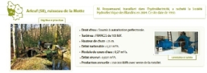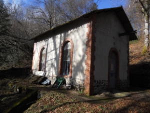 - La centrale hydroélectrique C'est la seule construction située à l’Ouest de la route. Son alimentation est réalisée par une déviation du ruisseau de la Motte et une vanne de régulation (manuelle) visible du bord de la route. Cette centrale est toujours en service. D'ailleurs "toujours" n'est pas le terme exact, à nouveau en service conviendrait mieux. En effet, elle fut laissée à l'abandon dès la fermeture de la carrière et jusqu'à 1970. A cette époque il ne restait que les 4 murs et du métal rouillé à l'intérieur. Remise en état, elle continue à tourner depuis, un peu au gré du débit du ruisseau de la Motte.