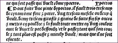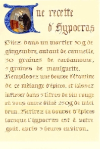 Ypocras, ypocrasse, hipocras, hipocrás, hippocrass, ipocras, ippocrasso, hypocras, hypporcas et peut-être d’autre orthographes encore, mais il s’agit de la même chose. Son nom viendrait du grec « hypos » (sous) et « crasis »