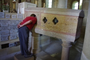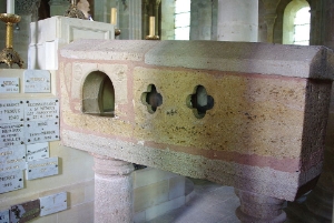 Après la mort de Menulphe, Blaise, le beurdin, ne comprit pas que son protecteur n’était plus. Il passa de longs jours et de longues nuits sur la tombe de son ami située initialement dans le cimetière Saint-Germain de Mailly-sur Rose. Il avait même creusé la tombe et pratiqué un trou dans le cercueil, probablement avec l’aide du curé, pour pouvoir mieux « parler » avec « Menou ». Devant tant d’attachement, le curé du village finit par accepter de construire un sarcophage spécial pour respecter la dévotion de Blaise. La légende dit que lorsque le bon Blaise, notre « beurdin », entra sa tête dans le trou aménagé dans le sarcophage, il se mit à prier avec ferveur. Et, quand il se dégagea du sarcophage, il en apparu visiblement « débeurdiné » devant les villageois stupéfiés qui se rendirent compte que Blaise avait changé, ce n’était plus un beurdin ! Le sarcophage est donc également percé d'un trou en demi-cercle sur le flanc. Selon la légende, les « simples d'esprit » (les beurdins) mais aussi les esprits « tourmentés ou en souffrance » venaient (et viennent toujours) passer la tête pour y laisser leur « folie » ou leurs maux de tête. Quelques ex-voto témoigneraient des effets (supposés) qu'aurait cet orifice. En réalité, si ce sarcophage a pu avoir un quelconque effet et provoquer quelques miracles, c’est (presque) devenu une simple attraction pour touristes venus satisfaire leur curiosité ! Mais, attention toutefois à ne pas toucher les bords du trou en passant la tête, car la légende veut aussi que celui qui mettrait sa tête en contact avec le sarcophage récupèrerait toute la folie accumulée dans la pierre par ceux qui sont passés avant.