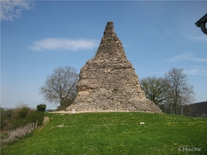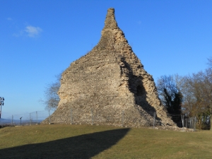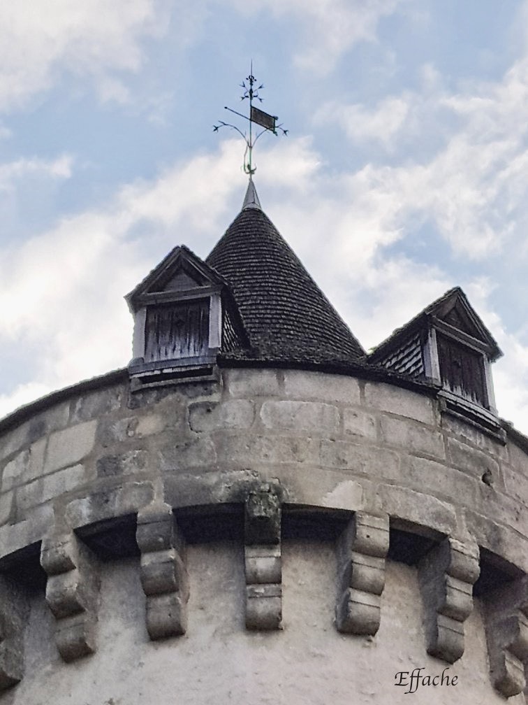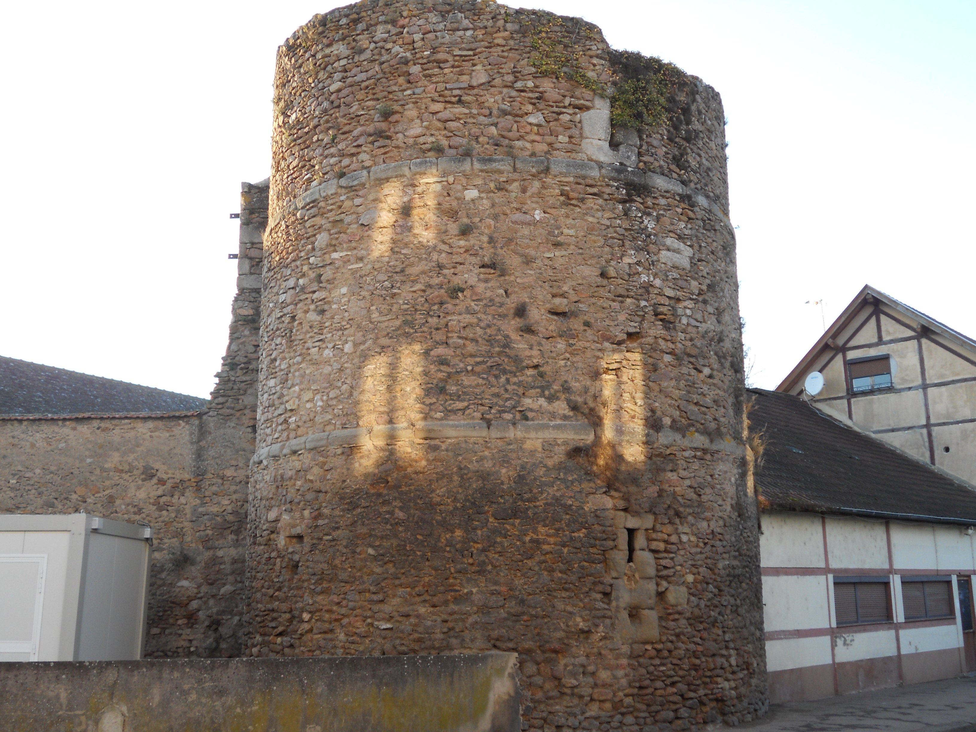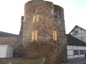 La tour ci-dessus, à 3 niveaux, aussi appelée « Tour de la chauve-souris » ou « Tour de la Chavoiche », est percée de meurtrières mais ne présente aucun créneau.