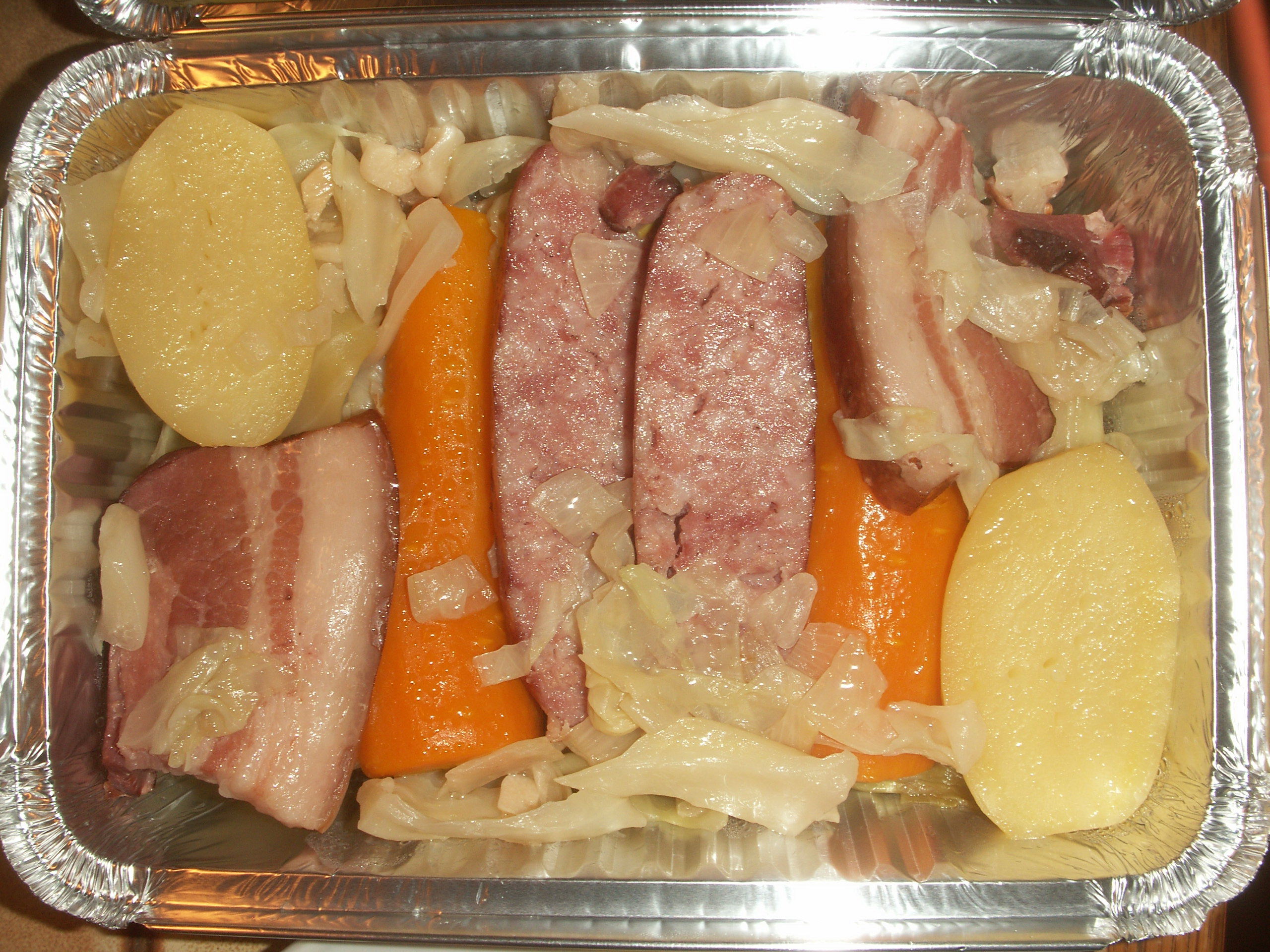 - Ajoutez les saucisses, la queue de cochon, le chou vert, les carottes, les navets, ainsi que les poireaux (pas les pommes de terre)
