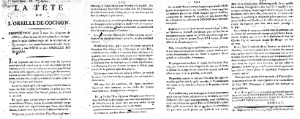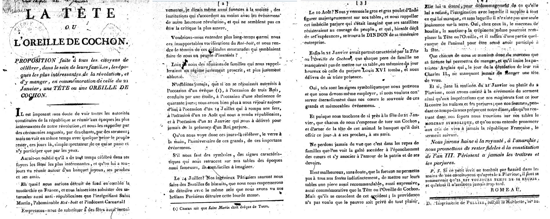 Quelles seraient donc les véritables origines de ce plat ? Ce que l’on en sait remonte à la révolution En 1793, le citoyen Romeau, dans un pamphlet intitulé "la tête ou l’oreille de cochon", préconisa de remplacer les « saturnales » par des fêtes républicaines, des banquets joyeux et populaires, pour « célébrer le verre à la main, ces grands et importants événements ». ![]() Pamphlet « la tête ou l’oreille de cochon » Les saturnales ou fêtes religieuses telles la Saint Martin (relation entre le Saint protecteur des militaires, des tailleurs, des aubergistes et des marchands, né un 11 Novembre 316 et le jour où l’on met en perce les tonneaux de vin nouveau…), le « Roi boit » ou Epiphanie (celui qui a tiré la fève « pense » être roi…) ou