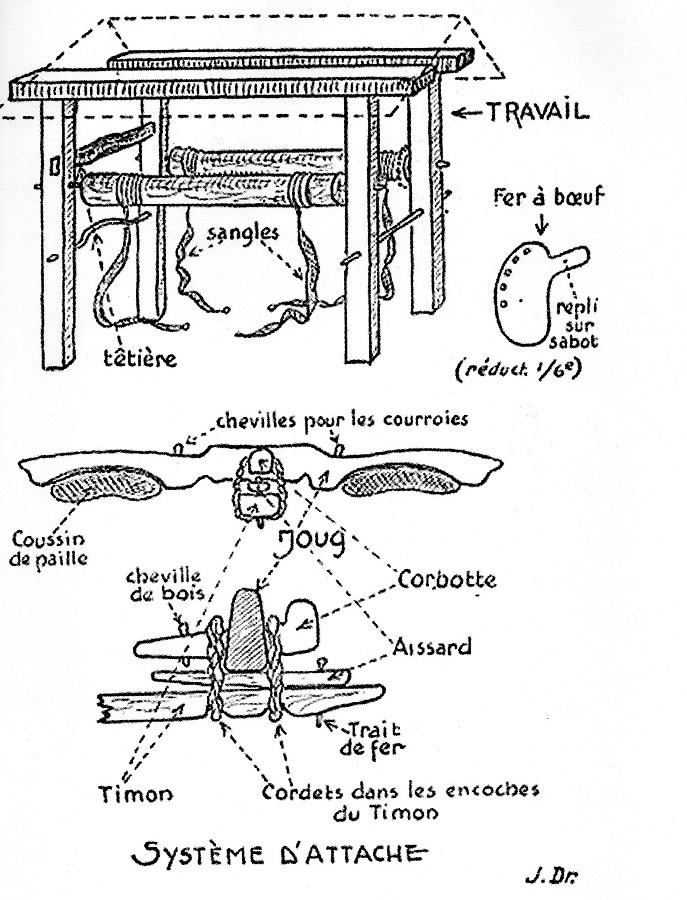 Le Sud-Morvan utilisait plus spécialement des travails formés de montants en bois sur lesquels étaient accrochés des « brancards » que l’on passait sous le ventre des animaux qui restaient attelés par paires.