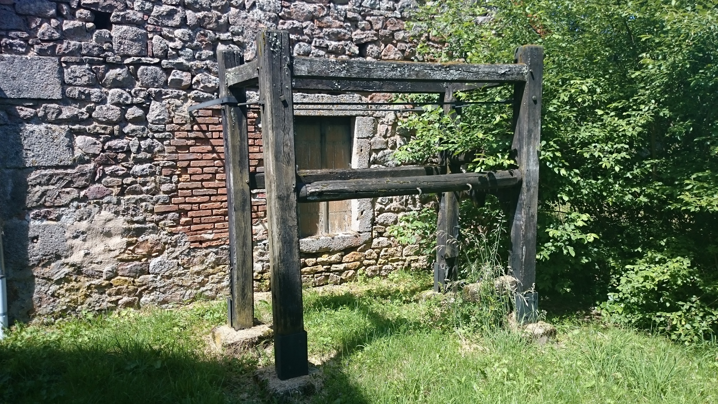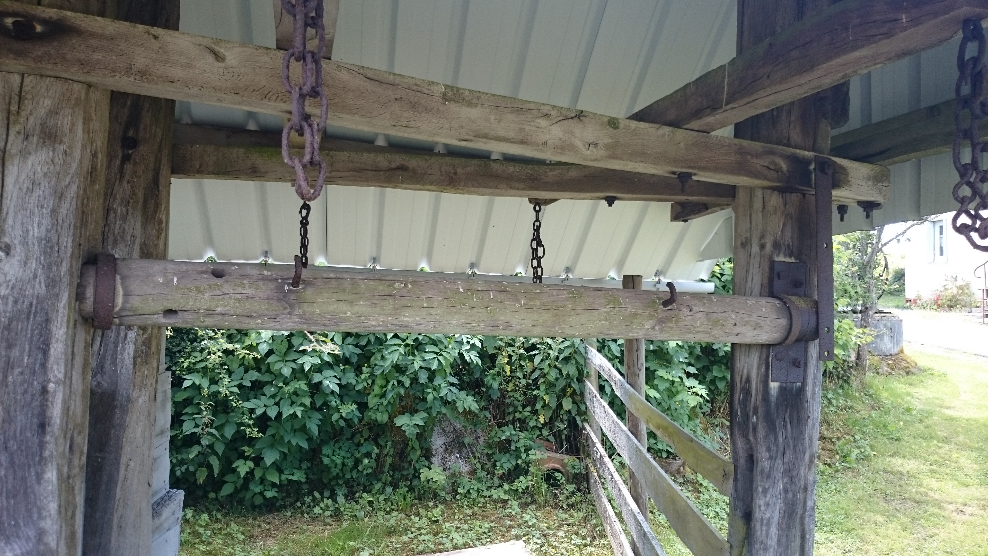 Un système de treuil, de rouleaux et de sangles permettait d'immobiliser et de soulever l'animal à ferrer ou à soigner et dont les cornes étaient attachées.